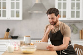 Człowiek zarabianie ciasta podczas oglądania online gotowania kurs za pomocą tabletu w kuchni