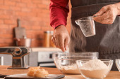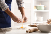 Mężczyzna robi ciasto na makaron przy stole w kuchni, zbliżenie