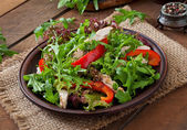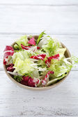 Apetyczny pomidor sałatka w misce na drewnianym stole