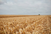 Pokroić ściernisko i plewy na polu kukurydzy obserwowanym pod niskim kątem pod szarą osłoną klocka w humorzasty jesienny dzień