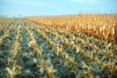 Pole ścierniwa z pozostałościami zebranej kukurydzy w widoku z niskiego kąta spoglądającymi w dół rzędów w pochmurny dzień