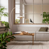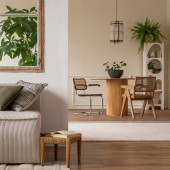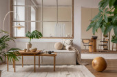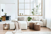Open space interior with modular sofa, wooden coffee table, big window, patterned pillows, braided plaid, stylish lamp, wooden coffee table, plants and personal accessories. Home decor. Template.
