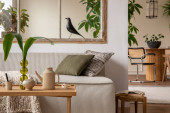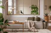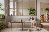 Zdjęcie "Open space interior with modular sofa, wooden coffee table, big window, patterned pillows, braided plaid, stylish lamp, wooden coffee table, plants and personal accessories. Home decor. Template." może być wykorzystywane do celów osobistych i komercyjnych zgodnie z warunkami zakupionej licencji Royalty-free. Obraz jest dostępny do pobrania w jakości wysokiej rozdzielczości do 5760x3840.