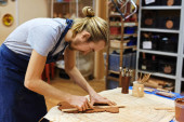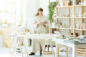 Zdjęcie "Młody sprzedawca lub pracownik warsztatu ceramicznego pakujący zamówienie klienta i pakujący go na papier stojąc przy stole na półkach" może być wykorzystywane do celów osobistych i komercyjnych zgodnie z warunkami zakupionej licencji Royalty-free. Obraz jest dostępny do pobrania w jakości wysokiej rozdzielczości do 5760x3840.
