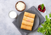Zdjęcie "Dolma. Nadziewane liście winogron (tradycyjna kuchnia kaukaska, turecka, grecka) na niebieskim talerzu ze świeżymi ziołami na jasnym tle z oliwą z oliwek, pomidorami i pieprzem. Widok z góry i przestrzeń kopiowania." może być wykorzystywane do celów osobistych i komercyjnych zgodnie z warunkami zakupionej licencji Royalty-free. Obraz jest dostępny do pobrania w jakości wysokiej rozdzielczości do 5760x3840.