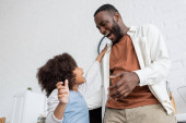 uśmiechnięty Afrykanin amerykański mężczyzna trzymając gazetę i patrząc na wesołą córkę z filiżanką herbaty