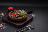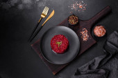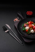 Zdjęcie "Sałatka ze świeżych pomidorów wiśniowych, rukoli, szpinaku, młodych liści buraka i innych zieleni na ciemnym, betonowym tle" może być wykorzystywane do celów osobistych i komercyjnych zgodnie z warunkami zakupionej licencji Royalty-free. Obraz jest dostępny do pobrania w jakości wysokiej rozdzielczości do 5760x3840.