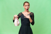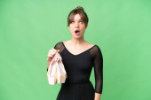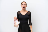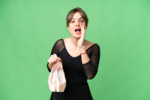 Młoda kaukaska kobieta ćwicząca balet na odosobnionym tle z zamiarem urzeczywistnienia rozwiązania podnosząc palec w górę
