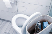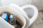 otwarta cysterna toaletowa, gdy system spłukiwania się zepsuje, brudna, źle płatna robota hydrauliczna