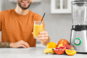 Mikser ze składnikami smoothie na białym marmurowym stole. Miejsce na tekst