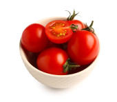 Miska smacznego ketchupu i świeżych pomidorów izolowanych na białym tle