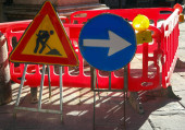 road construction site in the city and the signs with the big arrow