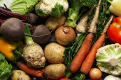 Różne świeże warzywa jako tło, widok z góry. Zbiory dla rolników