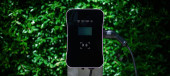 Progressive asian man and electric car with home charging station. Concept of the use of electric vehicles in a progressive lifestyle contributes to a clean and healthy environment.