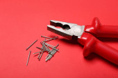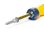zwarcie na białym tle żółty uchwyt śrubokręta i śruby