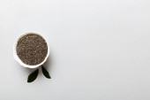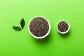 nasiona komosy w misce i łyżce na kolorowym tle. Zdrowa kinwa w małej misce. Zdrowa superżywność.