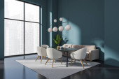 Niebieskie wnętrze spotkań z sofą i fotelami ze stołem, dywan na ciemnej betonowej podłodze. Panoramiczne okno na widok na miasto Singapur. Renderowanie 3D