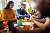 Zdjęcie "Grupa różnorodnych osób je lunch przy stole restauracyjnym. Koncepcja żywności i napojów" może być wykorzystywane do celów osobistych i komercyjnych zgodnie z warunkami zakupionej licencji Royalty-free. Obraz jest dostępny do pobrania w jakości wysokiej rozdzielczości do 5760x3840.