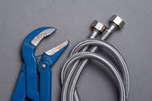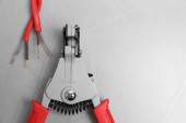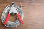 Nożyce i kable z odciętym drutem na jasnoszary stół teksturowany, płaskie układanie. Miejsce na tekst