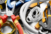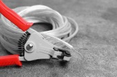 Zdjęcie "Nożyce i kable z odciętym drutem na jasnoszary stół teksturowany, płaskie układanie. Miejsce na tekst" może być wykorzystywane do celów osobistych i komercyjnych zgodnie z warunkami zakupionej licencji Royalty-free. Obraz jest dostępny do pobrania w jakości wysokiej rozdzielczości do 5760x3840.
