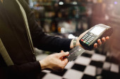 Widok niewyraźnego mężczyzny płacącego kartą kredytową w barze