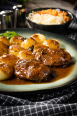 Kule mięsne mielone w sosie grzybowym, podawane z gotowaną bulwą.