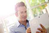 Zdjęcie "Człowiek z tabletem cyfrowym" może być wykorzystywane do celów osobistych i komercyjnych zgodnie z warunkami zakupionej licencji Royalty-free. Obraz jest dostępny do pobrania w jakości wysokiej rozdzielczości do 5760x3840.