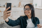 Zdjęcie "Uśmiechnięta młoda przyjaciółka, machająca ręką, rozmawiająca przez telefon siedząc na kanapie w domu. Bizneswoman w okularach na czacie przez videocall zrobić cześć gest, powitanie." może być wykorzystywane do celów osobistych i komercyjnych zgodnie z warunkami zakupionej licencji Royalty-free. Obraz jest dostępny do pobrania w jakości wysokiej rozdzielczości do 5760x3840.