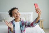 Uśmiechnięta młoda przyjaciółka, machająca ręką, rozmawiająca przez telefon siedząc na kanapie w domu. Bizneswoman w okularach na czacie przez videocall zrobić cześć gest, powitanie.