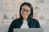 Zdjęcie "Smiling female waving hand to laptop greeting teacher at lesson consultation, sitting on couch at home. Friendly young woman say hello to friend speaking by video call. Online communication, elearning" może być wykorzystywane do celów osobistych i komercyjnych zgodnie z warunkami zakupionej licencji Royalty-free. Obraz jest dostępny do pobrania w jakości wysokiej rozdzielczości do 5760x3840.