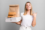 Młoda piękna kobieta czuje się szczęśliwa i wskazuje na siebie z podnieceniem. dostarczanie i odbieranie koncepcji żywności