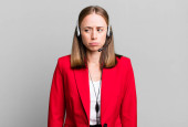 Biała, ładna kobieta, smutna, zła i spoglądająca w bok. koncepcja działalności gospodarczej