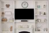 Zdjęcie "Stylowe półki z różnymi elementami dekoracyjnymi w pokoju. Projekt wnętrza" może być wykorzystywane do celów osobistych i komercyjnych zgodnie z warunkami zakupionej licencji Royalty-free. Obraz jest dostępny do pobrania w jakości wysokiej rozdzielczości do 5760x3840.