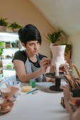Młoda kobieta pracująca z gliną w warsztacie ceramistów. Skupienie selektywne.