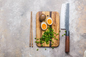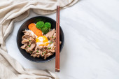 Pyszne poke miski mięsa, jajko, ryż i warzywa serwowane z sosem sojowym na białym marmurowym stole, płaskie nioski. Miejsce na tekst