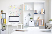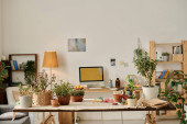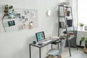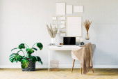 Biurko z monitorem komputerowym i inne dostawy kreatywnego freelancera wykwalifikowanego w projektowaniu stron internetowych i tworzeniu abstrakcyjnych kompozycji