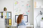 Zdjęcie "Tylny widok młodej kobiety freelancer w ubraniach casualwear siedzi w miejscu pracy przed monitorem komputera i tworzenia nowych stron internetowych w domu" może być wykorzystywane do celów osobistych i komercyjnych zgodnie z warunkami zakupionej licencji Royalty-free. Obraz jest dostępny do pobrania w jakości wysokiej rozdzielczości do 5760x3840.