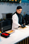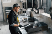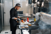 profesjonalna kuchnia w restauracji hotelowej kucharz przygotowuje składniki do hamburgera
