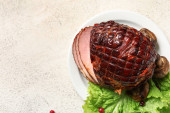 Płyta ze smaczną wędzoną szynką na białym drewnianym tle, zbliżenie