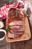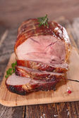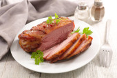 Płyta ze smaczną wędzoną szynką na jasnym tle płytek