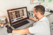 Lekarz dentysta pokazuje kobietom rentgen z planem i wynikami leczenia