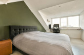 Zdjęcie "łóżko w rogu pokoju z zielonymi ścianami i białym drewnem podłogi po prawej stronie" może być wykorzystywane do celów osobistych i komercyjnych zgodnie z warunkami zakupionej licencji Royalty-free. Obraz jest dostępny do pobrania w jakości wysokiej rozdzielczości do 5760x3840.