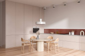 Zdjęcie "Białe wnętrze kuchni domowej z barem wyspa i stołek, strefa gotowania z półkami i naczynia kuchenne na szarej podłodze betonowej. Utwórz pustą ścianę działową. Renderowanie 3D" może być wykorzystywane do celów osobistych i komercyjnych zgodnie z warunkami zakupionej licencji Royalty-free. Obraz jest dostępny do pobrania w jakości wysokiej rozdzielczości do 5760x3840.