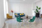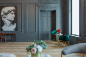 Elegancki, luksusowy wystrój pokoju ze staromodnymi antycznymi meblami. białe ściany ozdobione są reliefem. jest piękny ciemnobrązowy parkiet na podłodze.