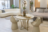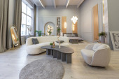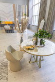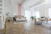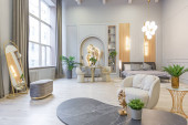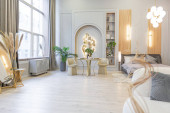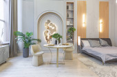 stylowe luksusowe wnętrze nowoczesnego studia w zielonych pastelowych kolorach z elementami drewnianymi. drogie meble i dekoracje