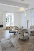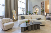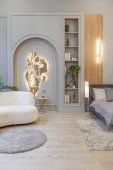 Zdjęcie "stylowe luksusowe wnętrze nowoczesnego studia w zielonych pastelowych kolorach z elementami drewnianymi. drogie meble i dekoracje" może być wykorzystywane do celów osobistych i komercyjnych zgodnie z warunkami zakupionej licencji Royalty-free. Obraz jest dostępny do pobrania w jakości wysokiej rozdzielczości do 5760x3840.