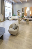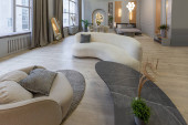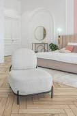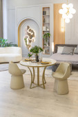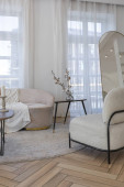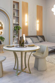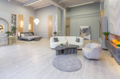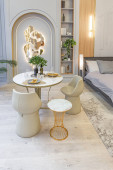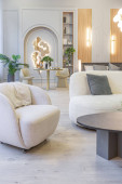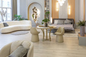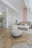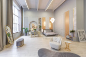 stylowe luksusowe wnętrze nowoczesnego studia w zielonych pastelowych kolorach z elementami drewnianymi. drogie meble i dekoracje
