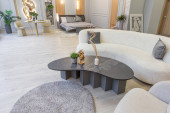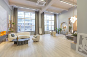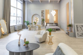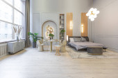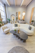 stylowe luksusowe wnętrze nowoczesnego studia w zielonych pastelowych kolorach z elementami drewnianymi. drogie meble i dekoracje