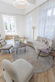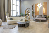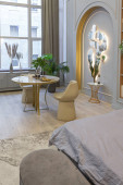 Zdjęcie "stylowe luksusowe wnętrze nowoczesnego studia w zielonych pastelowych kolorach z elementami drewnianymi. drogie meble i dekoracje" może być wykorzystywane do celów osobistych i komercyjnych zgodnie z warunkami zakupionej licencji Royalty-free. Obraz jest dostępny do pobrania w jakości wysokiej rozdzielczości do 5760x3840.