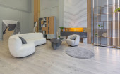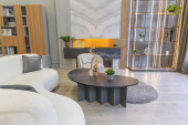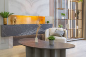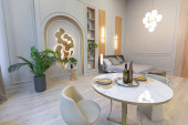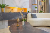 stylowe luksusowe wnętrze nowoczesnego studia w zielonych pastelowych kolorach z elementami drewnianymi. drogie meble i dekoracje